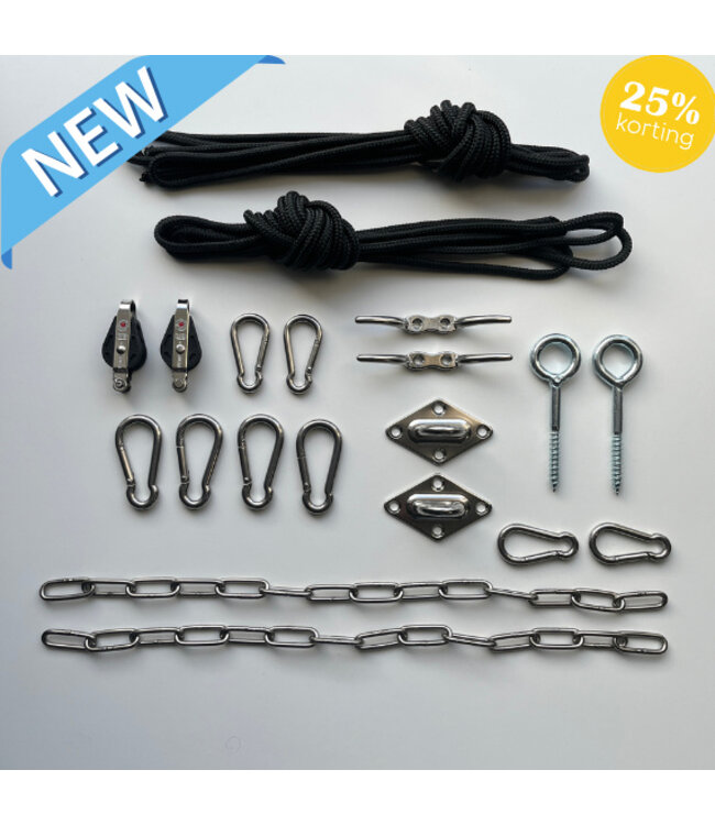 Complete katrolset voor het snel en gemakkelijk opspannen van een drie- of vierhoek schaduwdoek. Voor montage aan gevel en palen. Hiermee haal je het schaduwdoek er snel en gemakkelijk af, zonder een trap nodig te hebben. Kleur koord: zwart of wit.