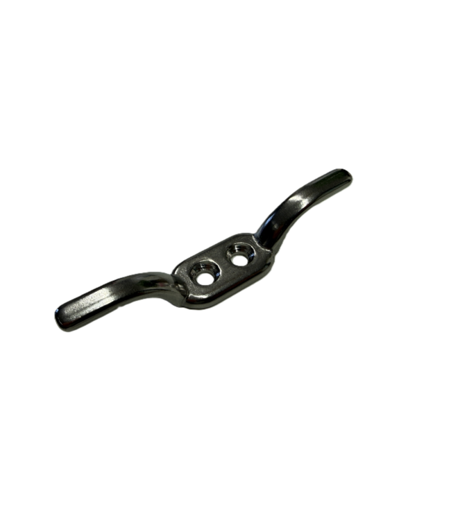 Koordkikker rvs. Met 2 schroeven te bevestigen aan paal/ muur. Lengte 11cm. Voor vastzetten van koord aan paal of muur. (Zit ook bij de katrolset in)